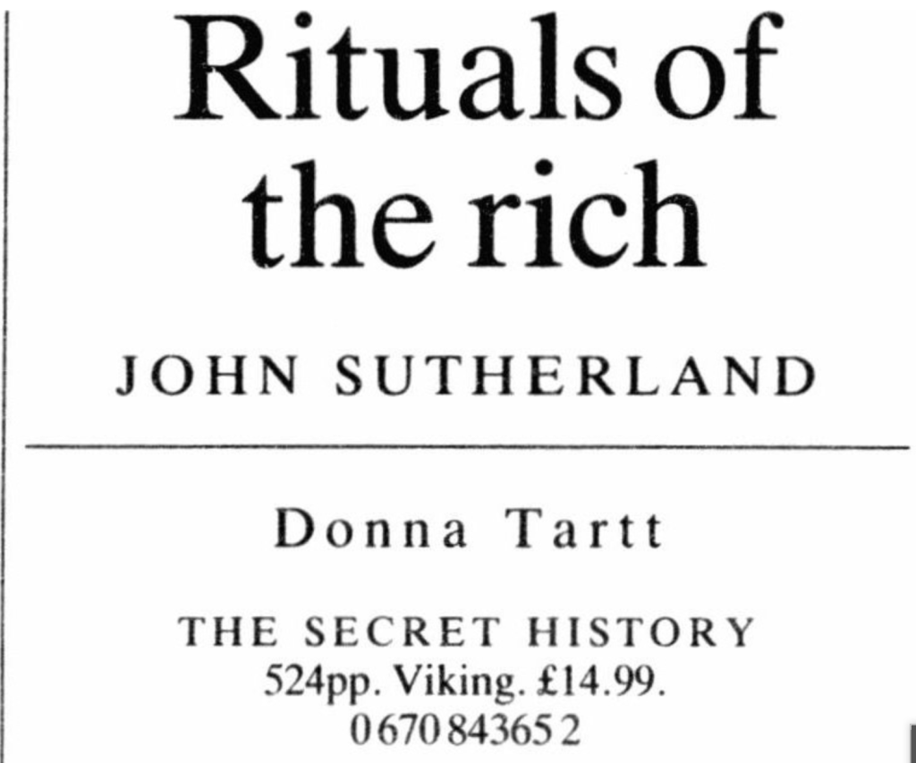 Literary critic and author John Sutherland reviewed The Secret History for the Times Literary Supplement in September 1992.